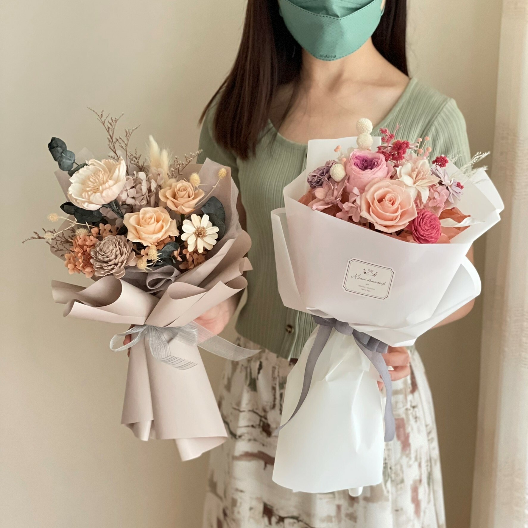 - 花材使用永生花與乾燥花,開放花材選色,由老師協助搭配設計。